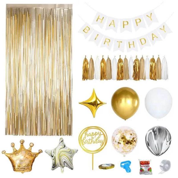 60 balónov rôznych farieb; 1x balón v tvare koruny; 2x balóny v tvare päťcípej hviezdy; 2x balóny v tvare štvorcípej hviezdy; 1x záves z trblietavých stúh; 1x transparent Happy Birthday; 5x sada farebných ozdobných strapcov; 1x dekorácia na tortu Happy Birthday; ozdobná stuha, príslušenstvo na viazanie balónov, lepidlo a páska na upevnenie balónov.